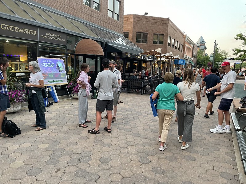 Above you see Pat, wearing a tam in the middle of the picture, talking with a couple who stopped because of the sign. To Pat’s right is Tracy his wife and to his left Steve engaging in Great Commission work.